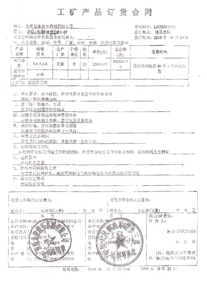 2008年10月28日中國人民解放軍總參三部物資處3名解放軍干部來我公司實地考察??疾毂容^后對我公司的規(guī)模和產(chǎn)品給予了極大的肯定,并就一直聯(lián)系的要購買的25臺鋁合金升降機簽訂了訂貨合同?,F(xiàn)我公司已按照約定如期交貨,總參三部驗收后非常滿意,并已全部付款到位。