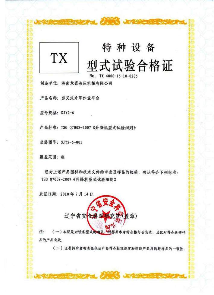 移動剪叉液壓升降機合格證